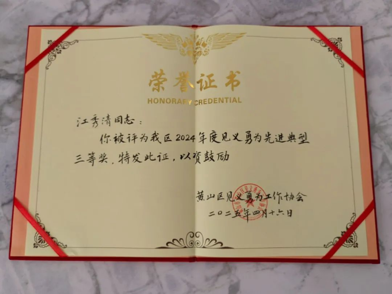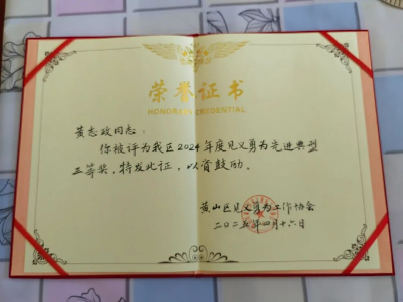为弘扬新时代见义勇为精神,激发社会正能量,黄山区甘棠镇玉河村黄志政和庄里村江秀青两名造血干细胞捐献者日前获评“见义勇为先进典型”荣誉称号,这是黄山区首次将造血干细胞捐献纳入见义勇为评定范畴。