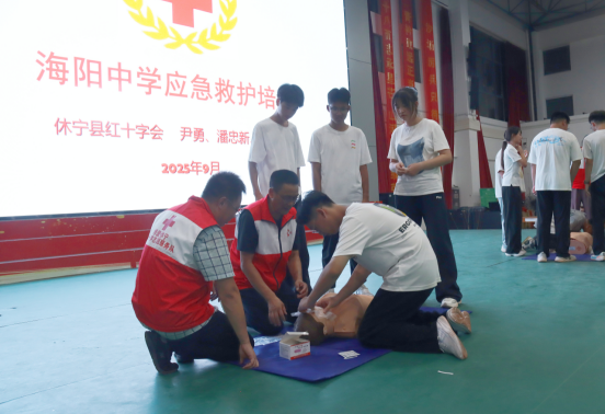 为增强高一新生的安全意识和应急处置能力,掌握基本的急救知识与技能,9月5日晚,休宁县红十字会利用军训晚间,为海阳中学新入学500余名高一新生开展应急救护培训。3位救护培训老师通过理论讲解、现场演示与实操练习相结合的方式,为同学们送上了一堂实用的 “生命安全课”。