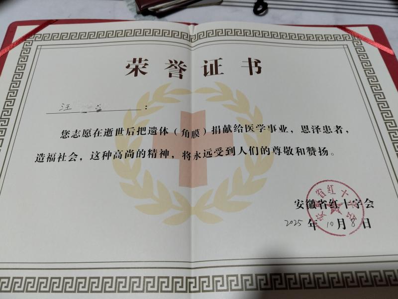 10 月 8 日晚,捐献仪式现场,没有哀乐的悲戚,只有对生命的敬畏与敬意。红十字会工作人员为汪先生家人送上了 捐献荣誉证书,向这位百岁老人的无私奉献致以最深的感谢。他的离去,不是终点,而是另一场 “生命接力” 的开始 —— 他的遗体将成为医学路上的 “灯塔”,照亮更多人健康的未来;他的精神更将成为一束温暖的光,激励更多人用无私与大爱,为这个世界增添更多美好。