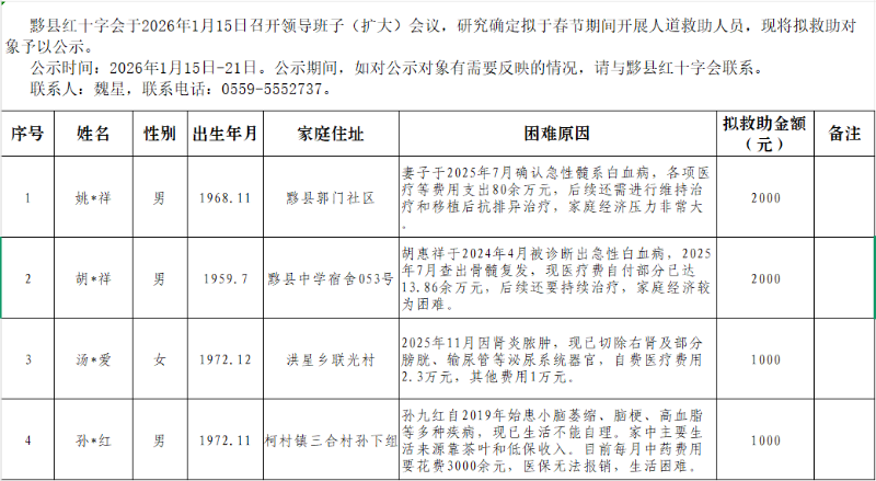黟县红十字会2026年春节期间拟救助对象公示