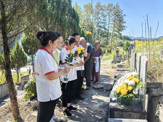 当天,红十字志愿者们早早地来到岩寺镇罗田村公墓,手捧花蓝和鲜花,神情庄重而肃穆的迎接汪阿根老人骨灰的到来。上午10点,皖南医学院工作人员按约定专程从芜湖专车将老人的骨灰郑重地交到老人亲属手中,志愿者们陪同家属一起举行了一场简短而庄重的告别仪式,没有繁复的流程,只有亲属对逝者选择的深深理解和志愿者的深情陪伴。大家集体默哀三鞠躬后,一一为逝者献上花蓝和鲜花,表达对逝者的崇高敬意。