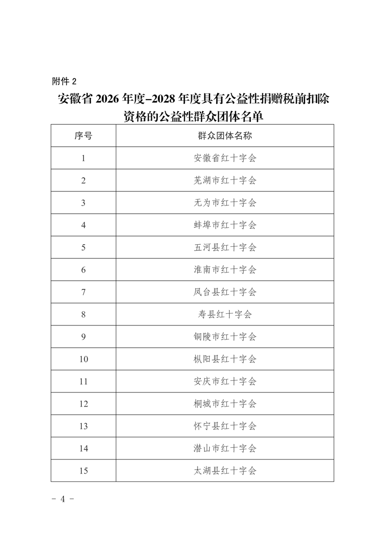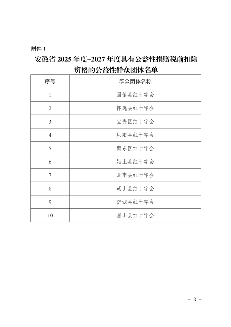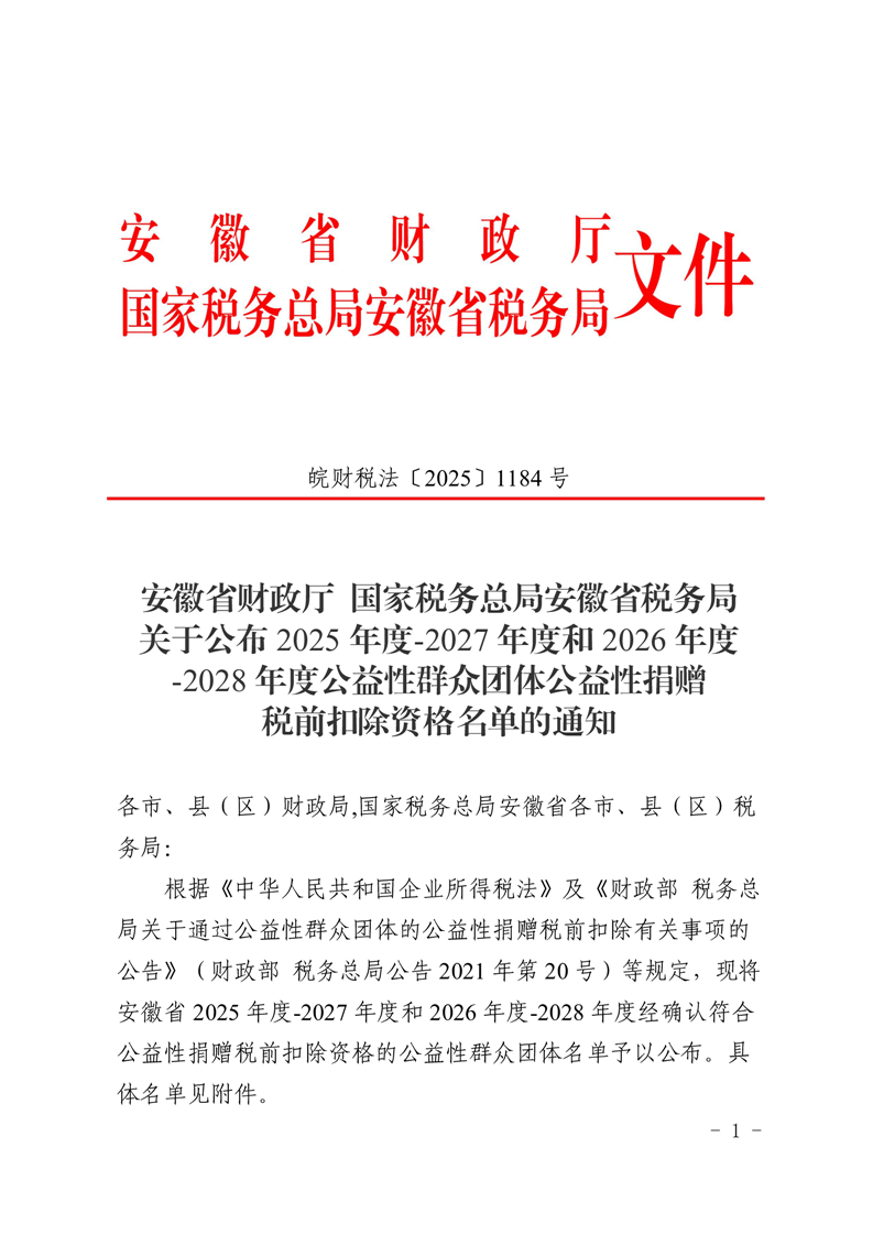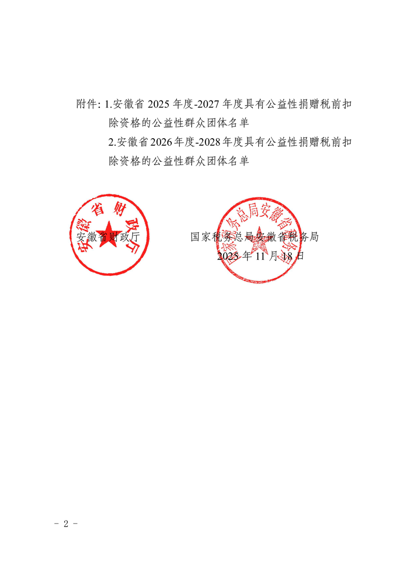 安徽省财政厅 国家税务总局安徽省税务局 关于公布2025年度-2027年度和2026年度-2028年度公益性群众团体公益性捐赠税前扣除资格名单的通知