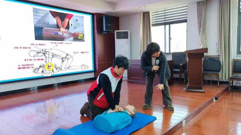 在理论教学环节,讲师围绕心肺复苏(CPR)、自动体外除颤器(AED)使用、气道异物梗阻急救等核心内容,结合应急高频场景案例,用通俗易懂的语言讲解急救原理与处置原则,让学员快速掌握“救命常识”。实操训练环节,培训现场配备多个模拟人、AED训练机等专业器材。讲师和助教团队分组指导学员进行心肺复苏按压、人工呼吸、腹部冲击法等实操演练,针对按压深度不足、人工呼吸节奏不当等问题逐一纠正,确保每位学员都能“学得会、用得上、做得准”。同时,讲解面对突发状况的现场处置等技巧,提升应急响应效率。
