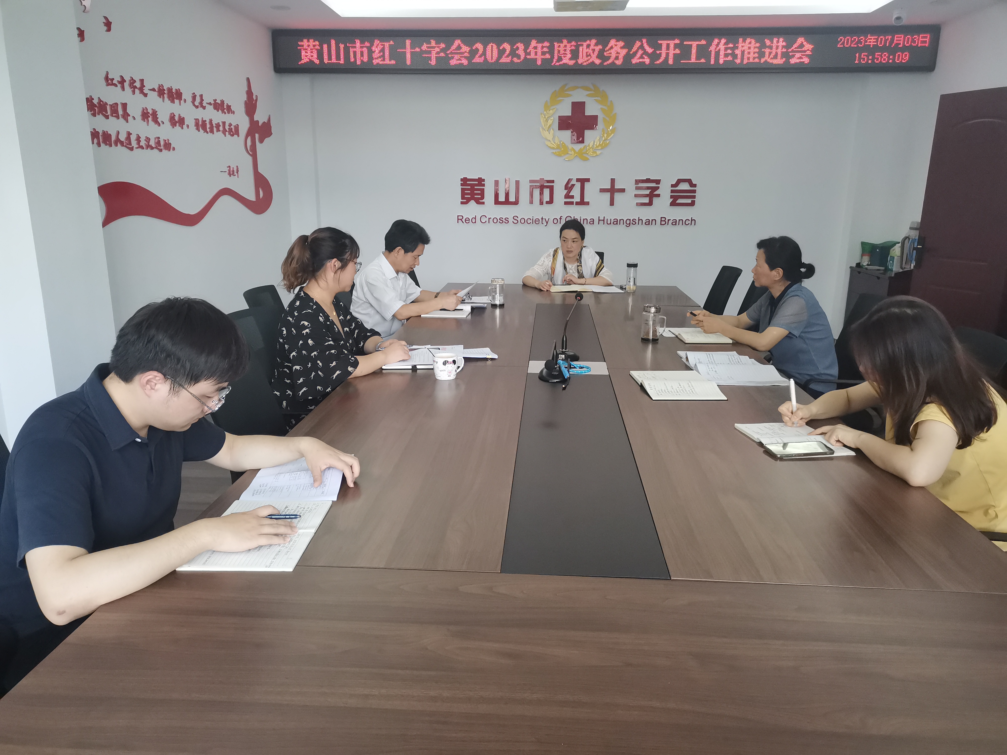 7月3日,市红十字会召开2023年度政务公开工作推进会,会议传达学习了黄山市2023年政务公开工作暨12345热线工作培训会精神,重点学习了《中华人民共和国政府信息公开条例》,并就2023年在决策公开、政策解读、新闻发布、依申请公开、年度报告、12345热线等方面工作进行了安排部署。