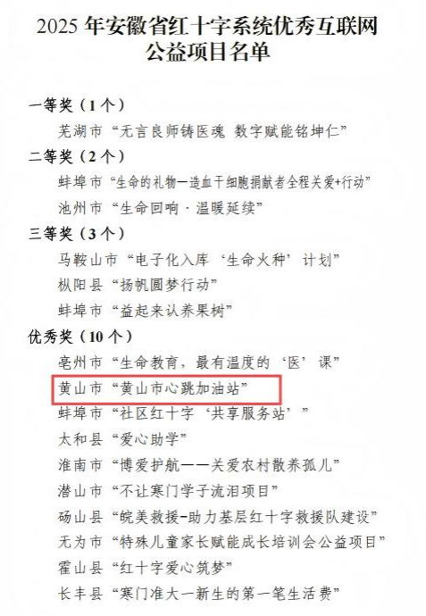 近日,安徽省红十字会公布2025年度全省红十字系统优秀互联网公益项目评选结果,黄山市红十字会申报的"黄山市心跳加油站"项目从全省46个参评项目中脱颖而出,荣获2025年安徽省红十字系统优秀互联网公益项目优秀奖。